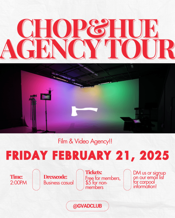 If you are interested in getting a behind-the-scenes look at this agency, join us as we tour Chop and Hue on February 21st at 2 pm. Direct message us on Slack for more information!