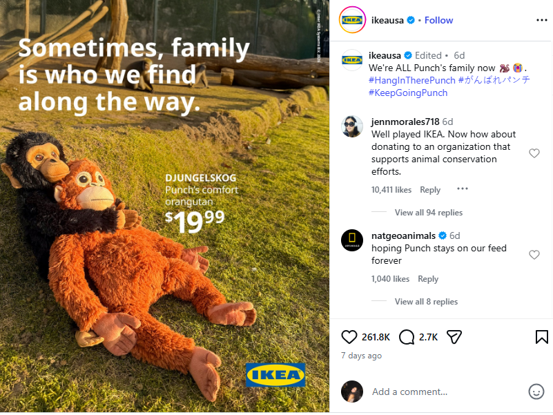What’s even more shocking is the outcome this viral moment had on IKEA sales. The IKEA Djungelskog orangutan plushie that Punch sought comfort in received overwhelmingly positive feedback and sold out globally. Naturally, IKEA’s Marketing Team took this traction and ran with it, showing the importance of emotional storytelling in advertising.