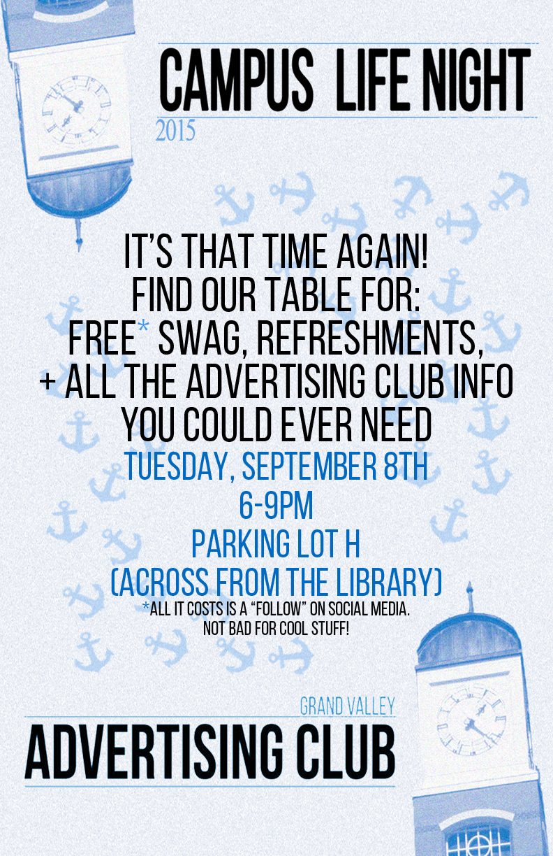Come find our Advertising Club booth at Campus Life Night, September 8, 6pm-9pm!
